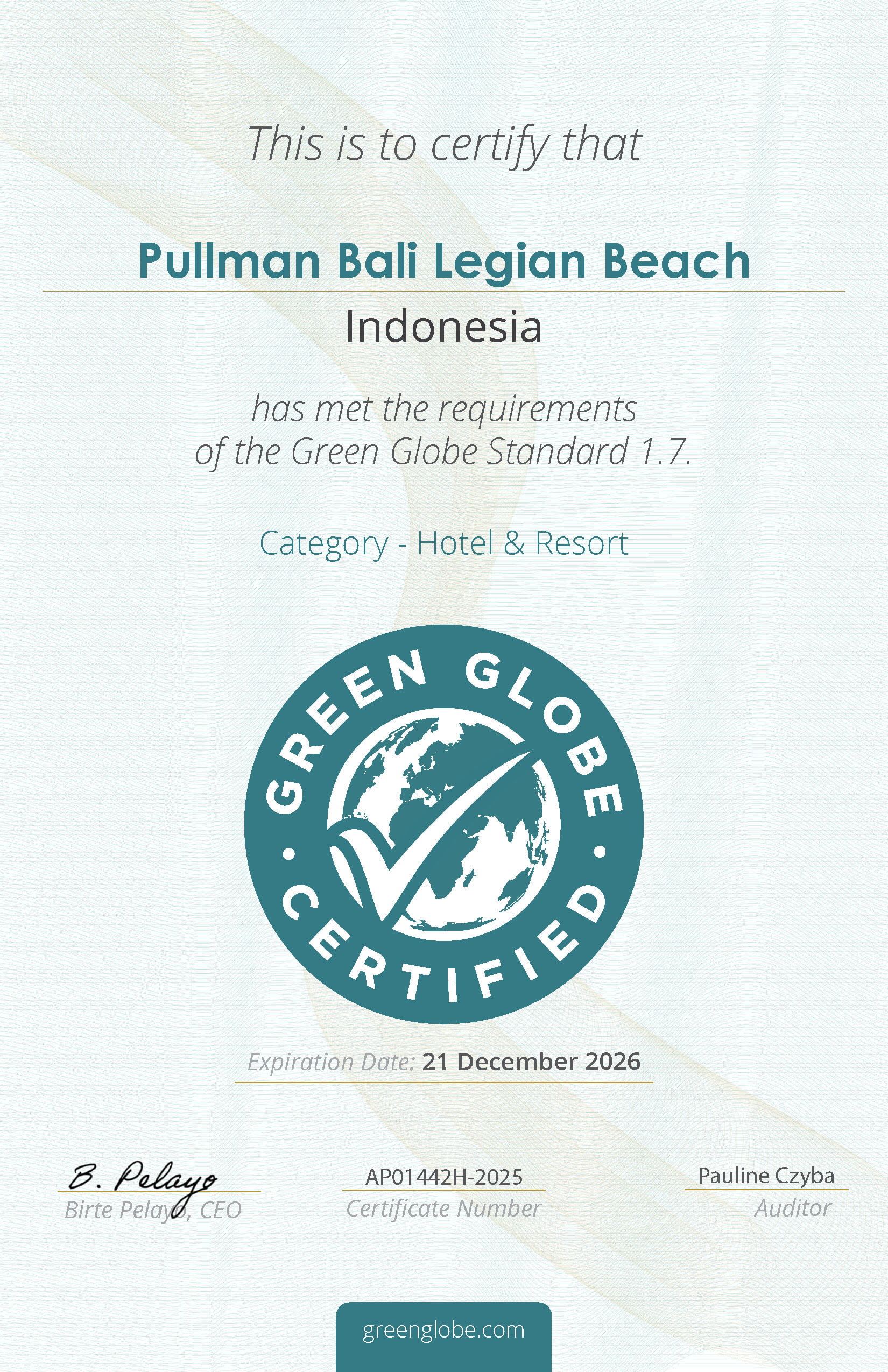 Pullman Bali Legian Beach is now Green Globe Certified.